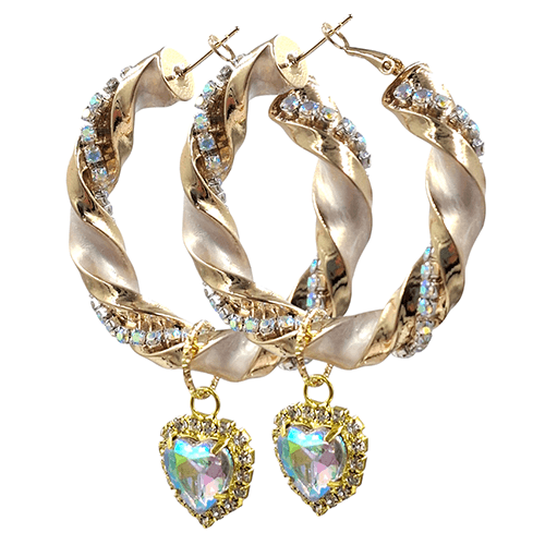 Vergulde twist / wokkel oorbellen, diameter 5 cm, creme-kleurige rand, meekleurende stras steentjes en stras hartbedels.