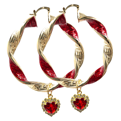 Deze vergulde twist/wokkel oorbellen hebben een diameter van 5 cm, een glinsterende rode rand gecombineerd met een rand stras.