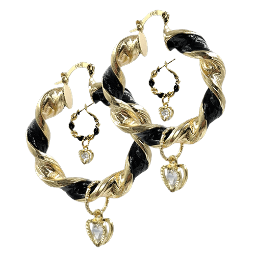 Vergulde twist / wokkel oorbellen met een rand van stras steentjes, een diameter van 5 cm. en vergulde hartbedeltjes.