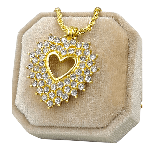 De blikvanger van de ketting is een groot hartvormig medaillon, volledig ingezet met sprankelende kristallen (pave-stijl). Het midden is voorzien van een shaker compartiment met “dancing stones” extra diepte. De hanger hangt aan een opvallende, gepolijste ronde veersluiting die dient als een stijlvol designelement aan de voorzijde.
