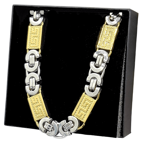 De verzilverde byzanthijnse schakel wordt afgewisseld met een vergulde meander schakel.