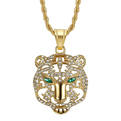 De hanger, 40 mm. hoogte x 35 mm. breedte heeft Jade-groene ogen en is ingelegd met heldere zirconia steentjes.