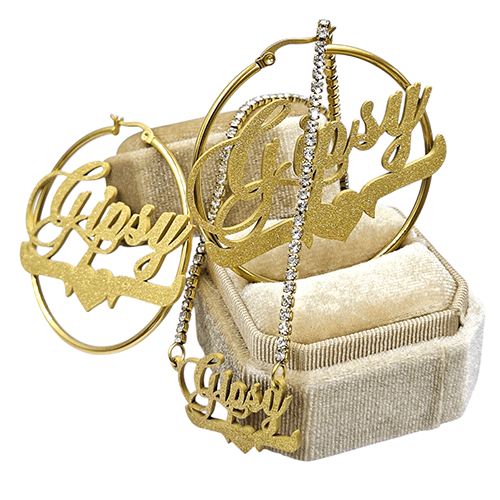 - Vergulde gladde creolen, diameter 5 cm, met centraal eveneens “Gipsy” geplaatst.