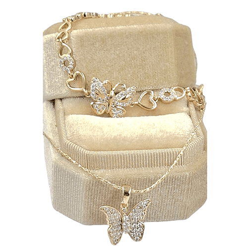 • Vergulde halsketting, verstelbare lengte van 50 + 5 cm. en een dikte van slechts 1 mm. Aan deze elegante halsketting is een vlinderhanger geplaatst volledig gezet met heldere zirconia steentjes.