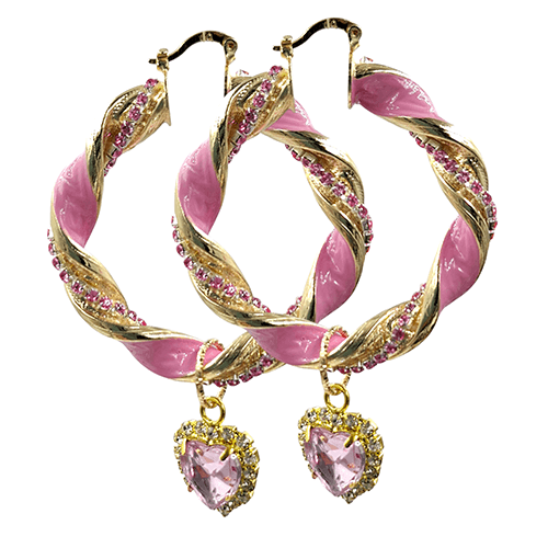 Vergulde twist / wokkel oorbellen, diameter 2 cm, turquoise rand en vergulde rvs hartbedeltjes met stras steentje.