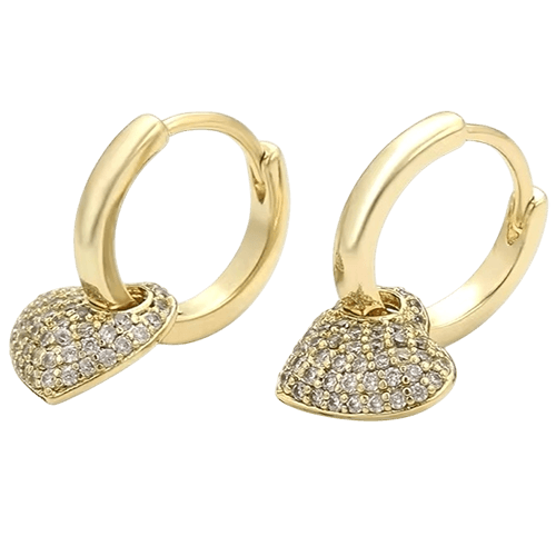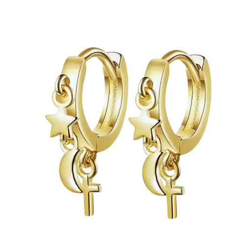 Kleine vergulde creolen met drie bedeltjes, maan, ster en kruis met verguld zilveren oorpin.