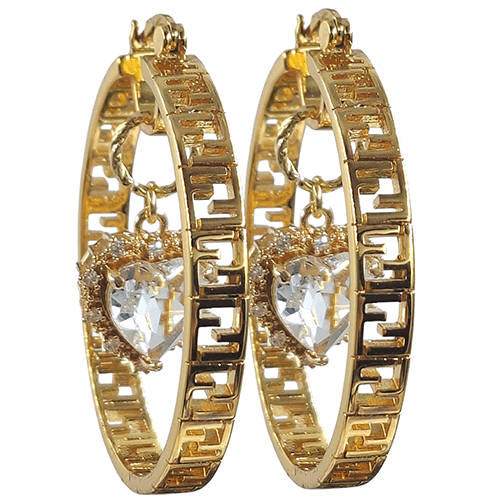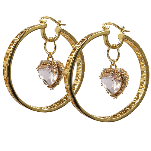 In deze oorbellen zijn vergulde hartbedels geplaatst met centraal een facet geslepen zirconia en een halo van kleinere zirconia’s.