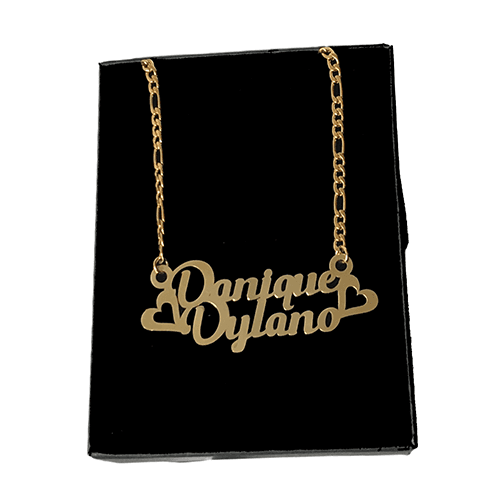 Vergulde naamketting met 2 namen, Figaro-schakel, lengte van 50 cm. en een breedte van 3 mm.