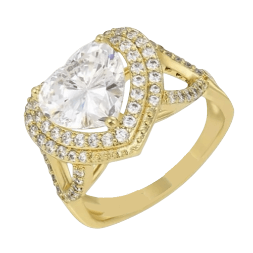Het middelpunt van deze betoverende ring is een imposante, heldere zirconia steen, geslepen in een elegante hartvormvorm. De hoofdsteen wordt majestueus omarmd door een dubbele halo van fonkelende, pavé-gezette zirconia steentjes, die het licht vanuit elke hoek vangen en weerkaatsen. Ook de slanke, gesplitste band van de ring is subtiel versierd met kleinere zirconia steentjes, wat zorgt voor een ononderbroken stroom van schittering en verfijning.