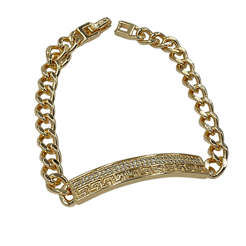 Deze elegante vergulde armband heeft roleks schakels, een sierplaat gezet met briljant geslepen zirconia en heeft een draaglengte van 17 tot 19 centimeter, schakelbreedte 8 millimeter.