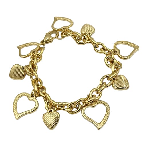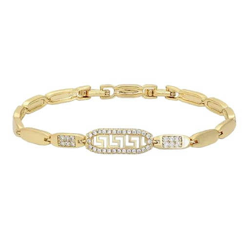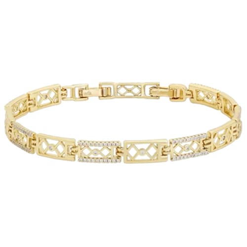 Deze elegante vergulde armband heeft langwerpige schakels met zirconia steentjes. De armband heeft een draaglengte van 19 tot 21 centimeter en een schakelbreedte van 6 millimeter.